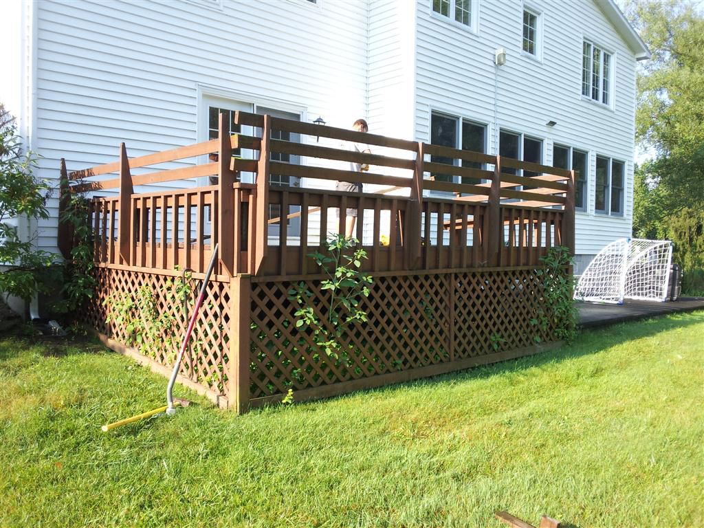 This pressure treated deck has two levels And solid skirting around the perimeter. The upper level is a self standing deck, and the lower level uses a ledger board attached to the house.This was done due to an existing concrete slab underneath the lower deck that could not be removed. We build all our decks to meet local building codes.