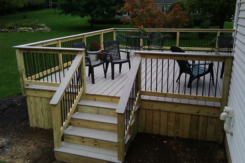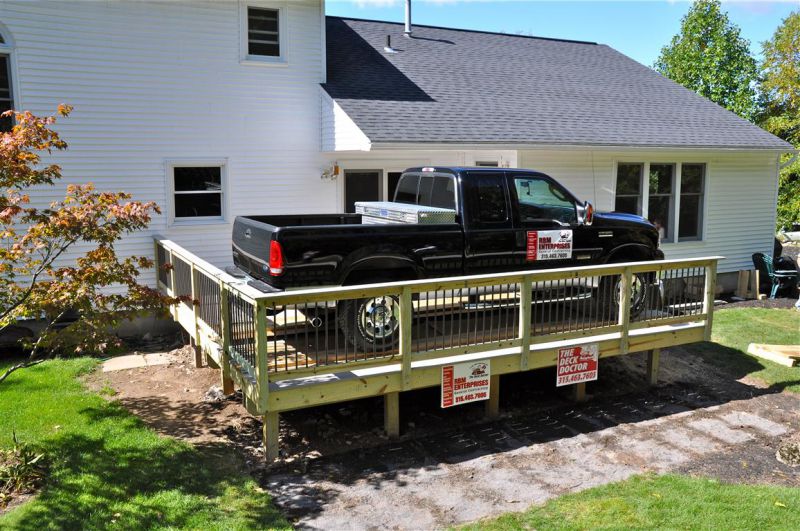 We took down the existing deck on this project and started from scratch. This deck is a pressure-treated structure, a low maintenance railing and Correct Deck composite flooring. The railing is a combination of aluminum coated decorative balusters, pressure-treated 4 x 4's and a composite handrail to match the floor. We also added a skirt for aesthetics and to limit access to any critters. This is also the deck we parked my F-250 truck on. By the way… The truck weighs over 3 tons!