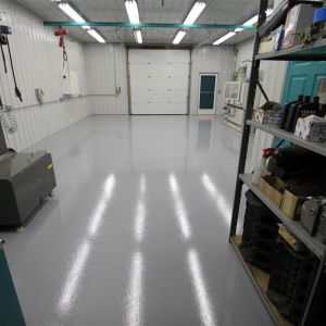 This epoxy was applied in a machine shop. There was an existing water-based single component epoxy on the floor that was peeling up. We removed the failing product, and after the floor was propped we applied a primer coat and two topcoats of haze gray industrial two part epoxy.